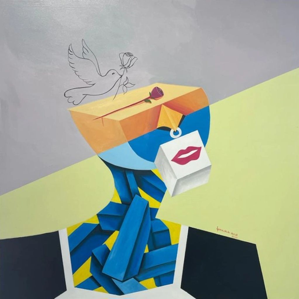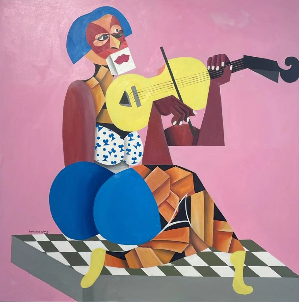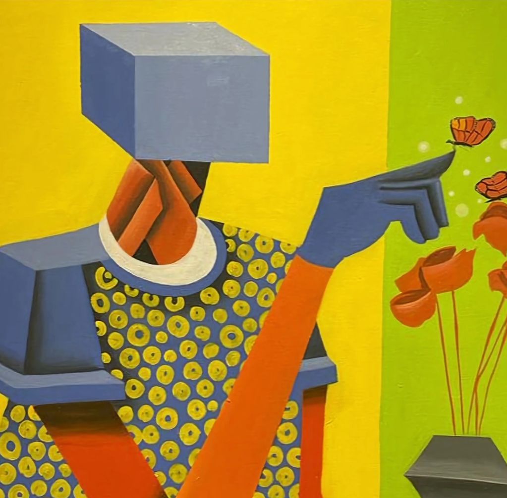 His paintings are an expression of figures using geometric shapes to carry out reality of activities and irony of life in our day to day lives. He is a colorist; he plays around with vibrant colors and brings out the originality of common objects around