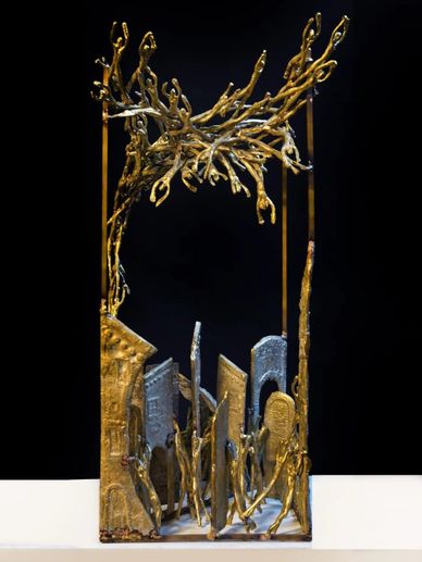 A bronze artwork that geometrically summarizes the old city with its gates, alleys, trees, and the close relationship with its inhabitants and people. It brings together the random alleys in a geometric square to signify the common connection between humans and the old city of Damascus.